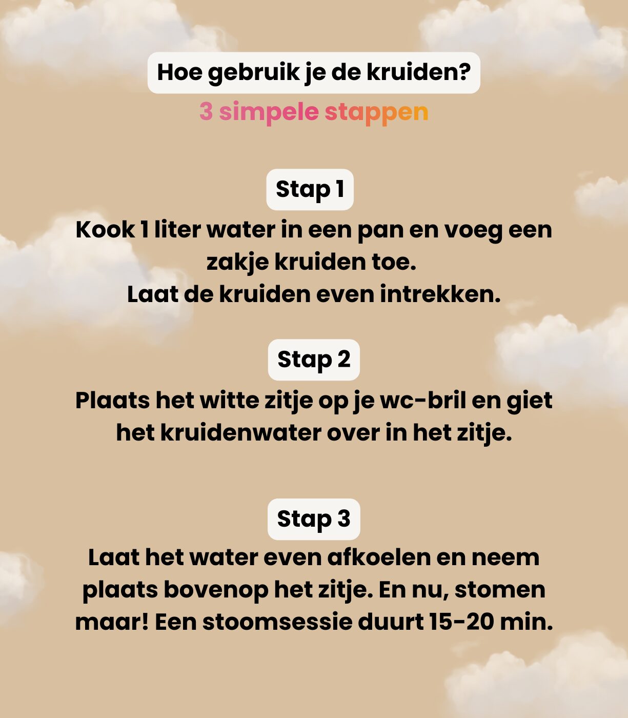 Boil about 1 liter of water, add 1 sachet of herbs, and let it steep for 10–15 minutes. Carefully pour the infusion into the Bloom Kitty seat, allow it to cool slightly, and sit for 15–20 minutes. You can find more detailed instructions on the back of the packaging.