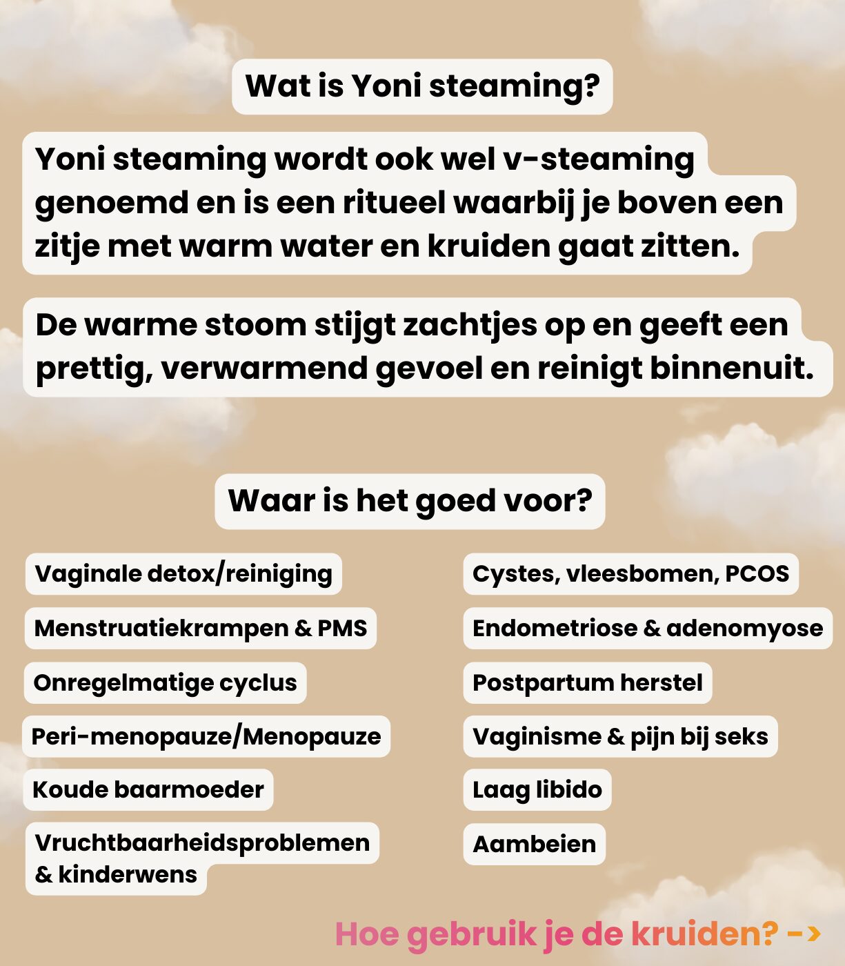 After a natural birth or a C-section, it’s important to allow your body to fully heal first. Most often, it’s advised to wait a minimum of 6 weeks, or until your midwife or doctor confirms that everything has healed well. After that, steaming can help further cleanse the uterus, support recovery, and leave you feeling fresh, clean, and comfortable again.