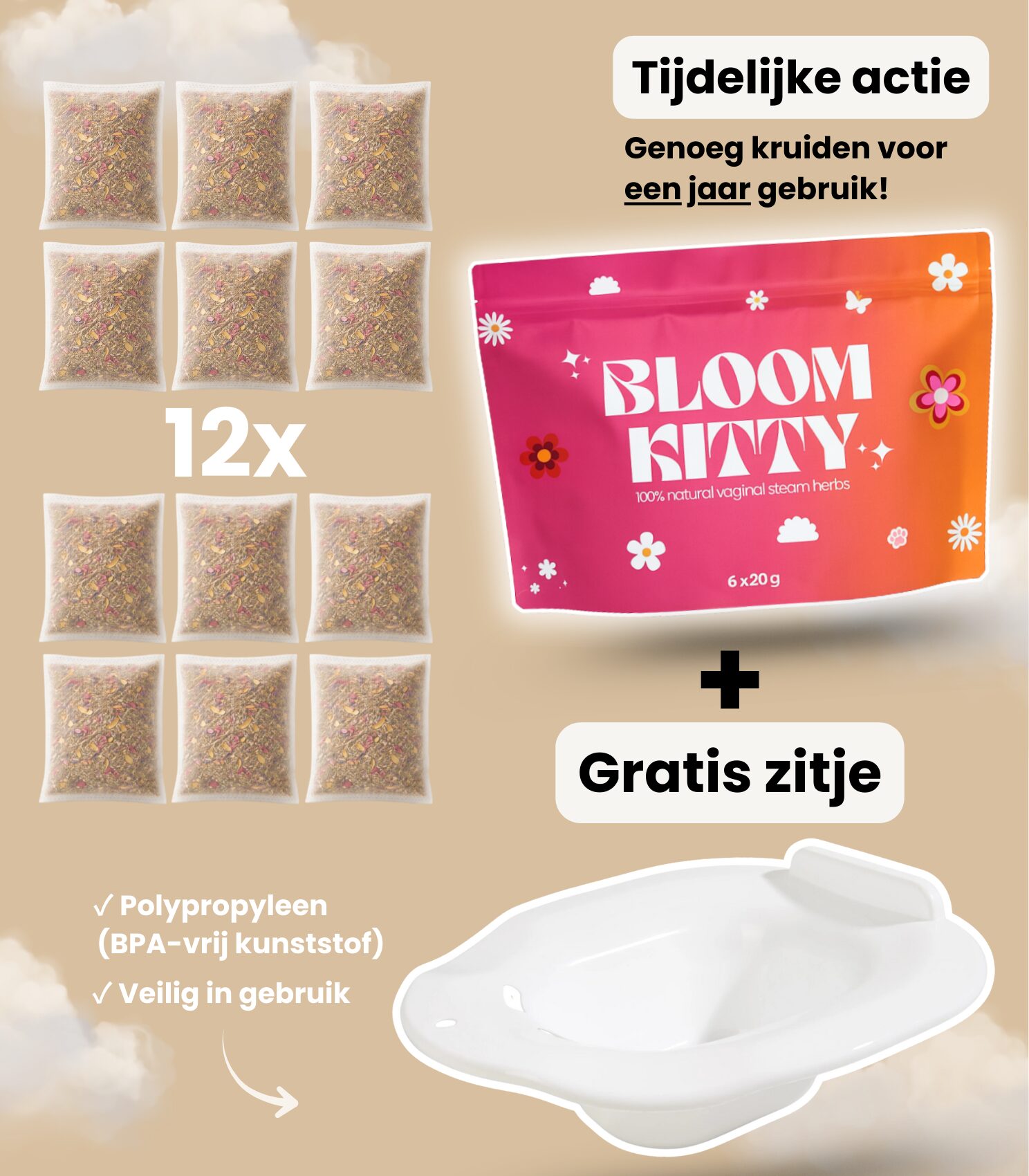 Boil about 1 liter of water, add 1 sachet of herbs, and let it steep for 10–15 minutes. Carefully pour the infusion into the Bloom Kitty seat, allow it to cool slightly, and sit for 15–20 minutes. You can find more detailed instructions on the back of the packaging.